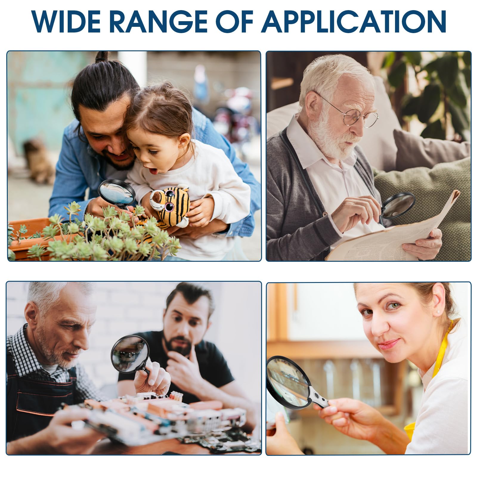 - LARGE LENS AND MULTIPLE USE: The 5.5 inch large and wide magnifying lens specifically mimics the way we naturally view things. The surface durable and scratch resistant, ideal for examining fine prints in reading newspapers, documents, maps, coins, stamps, electronic parts, jewelry, photos, and crafts, needlework, plants and other close work.