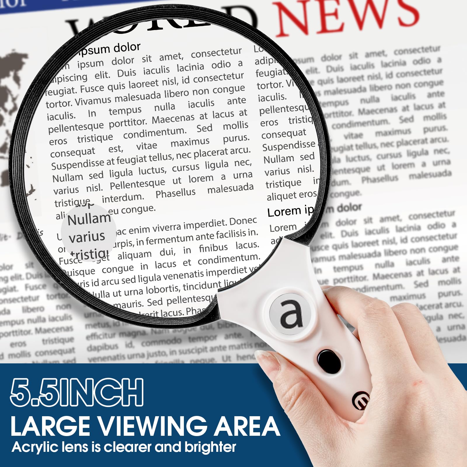 - HIGH POWER MAGNIFICATION: Equipped with high-power optical technology, this magnifier delivers exceptional clarity, turning tiny objects sharp. Unlike ordinary models, it offers consistent HD magnification across the 5.5 inch lens, no blind spots or blur. Perfect for small print (prescriptions, medicine bottles, coupons) and intricate details in crafts, electronics, or geological samples. Ideal for low vision, macular degeneration, or precise magnification needs.
